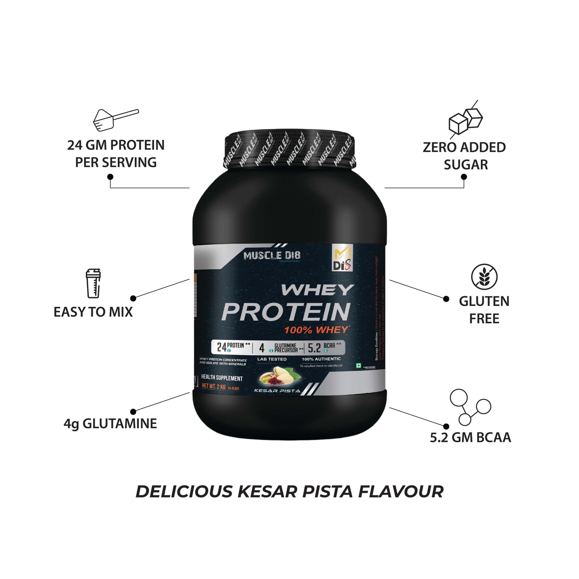 - Instant Mixability: Say goodbye to clumps and lumps. Our Kesar-flavored Whey Protein mixes easily in water, milk, or your favorite smoothie, ensuring a silky-smooth and indulgent drink every time.